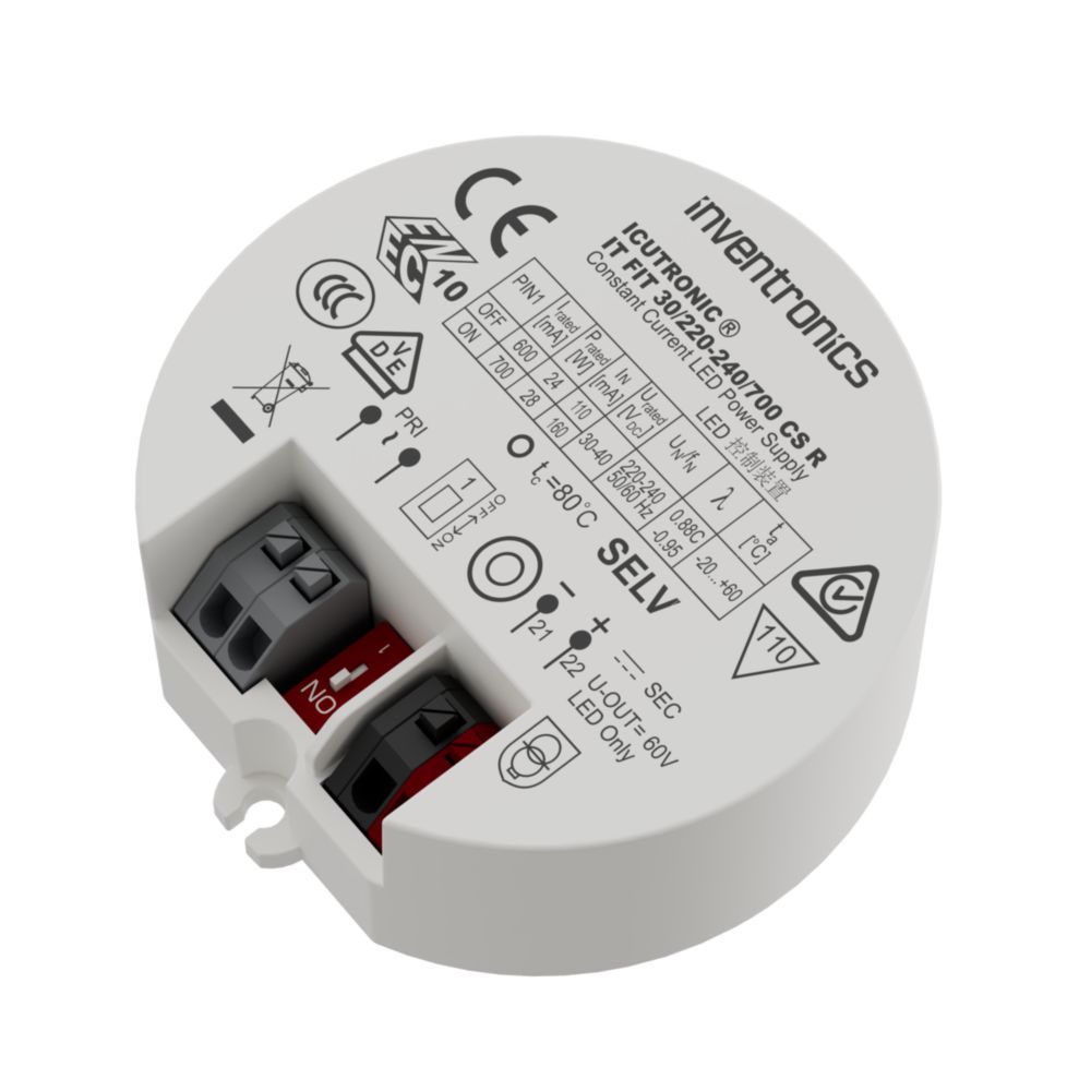 Modern lighting design demands compact solutions without compromise – and that’s exactly what the ICUTRONIC IT FIT CS R delivers. This new miniaturized on/off LED driver from Inventronics is designed for spotlights that need top performance in the smallest space. As luminaires continue to shrink while requiring higher efficiency, the IT FIT CS R helps manufacturers meet these challenges with a flexible, reliable, and cost-effective solution. With its round housing, this SELV driver can be built directly into the spotlight, without the need for extra driver compartment.